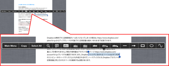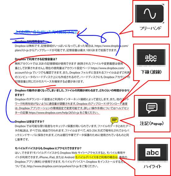GoodReaderは、PDFデータに対して、様々な注記を付加することが可能です。 |