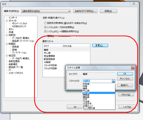 投影図・断面図を配置するFX2の図面内に一致するスタイルが存在すると、ここで指定した名前のスタイルでFXUに要素を配置します。